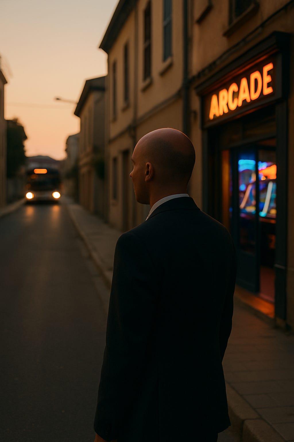 The arcade made its own weather: dimmer, cooler, louder. Coins clinking. Neon strobes pulsing in a steady, predictable rhythm. Buttons clicked. Speakers cheered. Lights blinked and scrolled and asked for another round. David moved through it all like someone checking the pulse of a sleeping animal — a slim man with a clean-shaven head, always in pressed trousers and polished shoes, carrying a faint trace of aftershave even in the sticky heat.